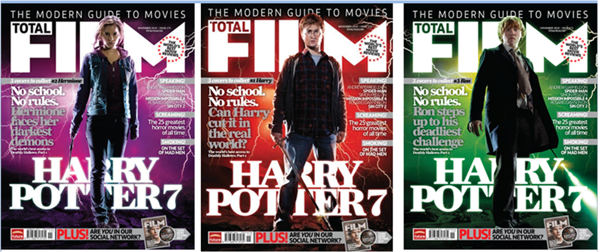 Total film magazine is successful, as it is a versatile business; it allows readers to view its magazine by print and electronic means (through downloading the app on the Apple newsstand/Google play). This means that it will not lose profit due to the rising global demand of magazines/books/newspapers to be made available on electronic systems. The app also has extra functions which allows its market to see trailers, pictures and animation. Total film targets its audience with a range of different platforms such as its website, YouTube channel, Twitter page, Facebook page, iPad app and Google+ page.Total film has released at least three versions of its November 2010 magazine issue promoting the 'Harry Potter Franchise' (depicting three different characters, Hermione, Harry and Ron). This is done so that each magazine version will attract a specific Harry Potter audience, e.g. the issue which features the character, Hermione Granger, displays Hermione as having an audacious and brave stance which is often seen in male characters. This is what may captivate the female audience and fans of Hermione Granger to this magazine issue.